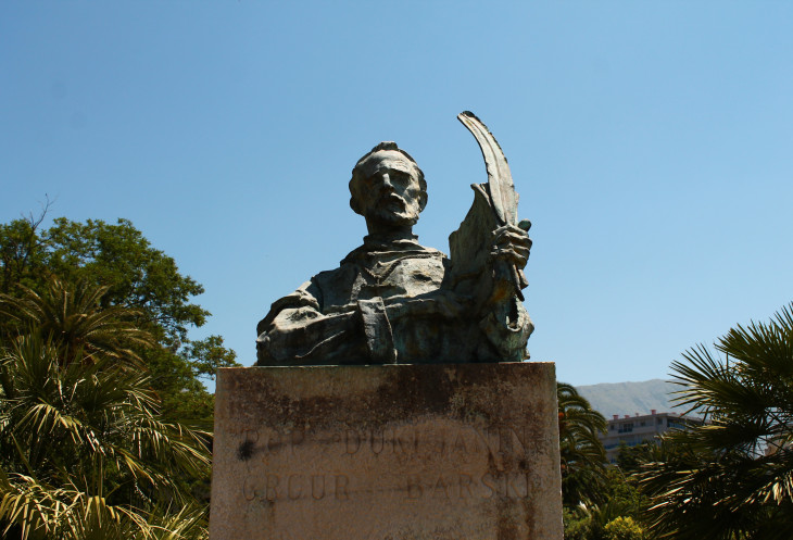 Но оторваться надо - нас впереди ждало ещё кое-что интересное... Если верить Викимапии - где-то здесь, на мысе, должен быть старинный монастырь Богородицы Ратачкой, знаменитый тем, что в его стенах в XII веке была создана "Летопись попа Дуклянина". Поп Дуклянин - личность легендарная, в том смысле, что на самом деле никто не знает, как звали того монаха, перу которого принадлежит этот самый древний литературно-исторический эпос южных славян, по своей значимости равный нашей "Повести временных лет". История не сохранила до нас его настоящего имени, а "фамилия" Дуклянин - она придумана по названию государства, на территории которого был основан монастырь. В то время не было конечно никакой Черногории, не было даже государства Зета, на месте которого была создана Черногория. А было только сербское государство (княжество) со смешным названием Дукля, которое располагалось вдоль побережья современной Черногории от берегов Которского залива до территории современной Албании, захватывая окрестности Скадарского озера и долину реки Зета. И особенно подробно монах описывал именно историю Дукли - до XII века, собрав в Летописи все народные сказания и исторические легенды славян, населявших её территорию. Труд этот с исторической и культурной точек зрения совершенно неоценим, и благодарные потомки уже в современное время поставили на набережной в Баре памятник попу Дуклянину и ежегодно в Старом городе Бара проводят фестиваль "Барская летопись": http://www.rutraveller.ru/event/annual/1905
