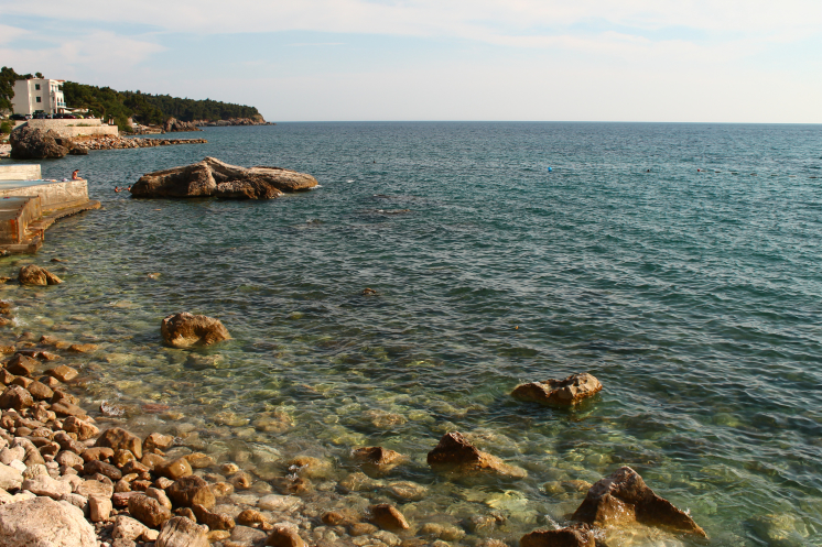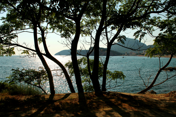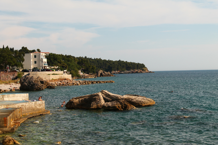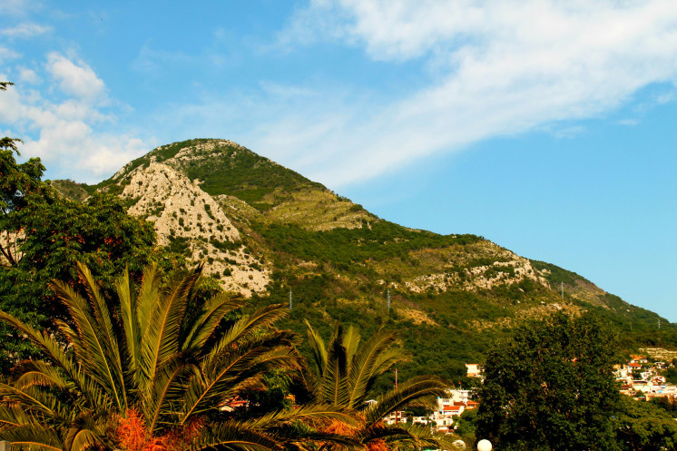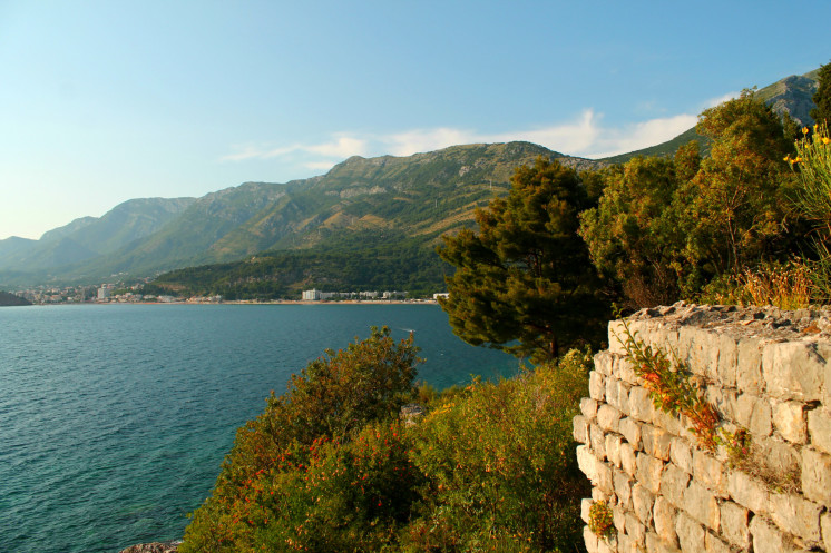 Набережная - около 2х км, в центре довольно пустынная - после вывески с мороженым нет ни апартаментов, ни даже кафе (на набережной, я имею в виду, на пляже - есть), они вновь появляются после гостиницы вида "пансионат времен СССР" ближе к восточной окраине пляжа. Здесь, правда, уже не Сутоморе, а поселок под названием Брца, снова появляются всевозможные кафешки, магазинчики и уходящие наверх, в гору, домики со сдаваемыми туристам апартаментами. Да, здесь рельеф местности кардинально отличается от равнинной западной части Сутоморе: набережная заканчивается - от нее вверх уходит дорога, по которой выезжают с пляжа машины, а мы идем в сторону мыса Ратац. От набережной до него идти минут 10. А от ресторана "Извор", что в начале набережной, до мыса - полчаса бодрым шагом. Это если не застревать с фотоаппаратом)) но я же так не могу... поэтому мы ползли около часа) А куда торопиться-то?)) В отпуске не торопиться надо - а СОЗЕРЦАТЬ и НАСЛАЖДАТЬСЯ...)))