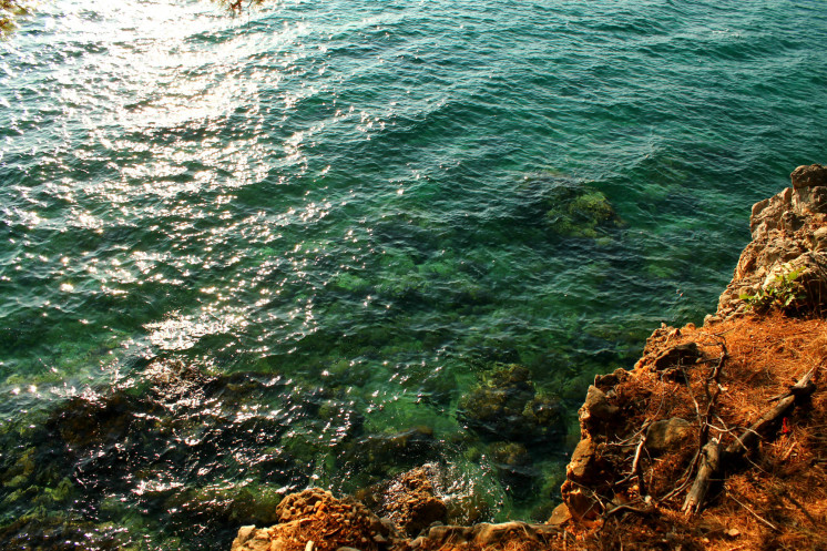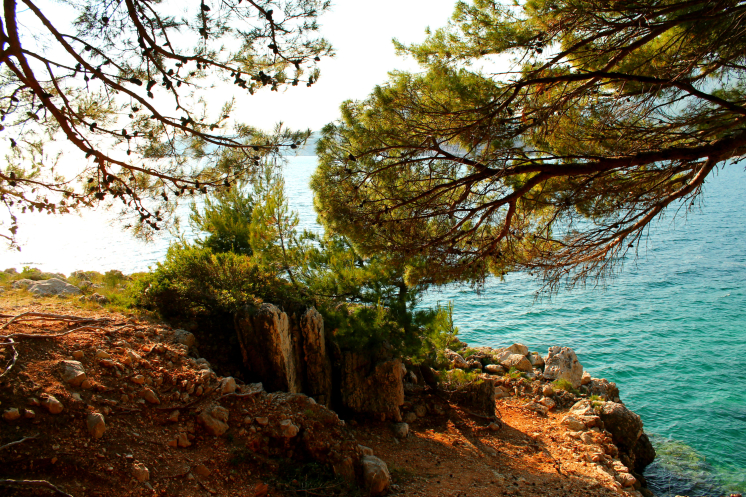 Мы продолжали идти вдоль скалистого берега моря, любуясь водой феерических оттенков и причудливо изогнутыми средиземноморскими сосенками: