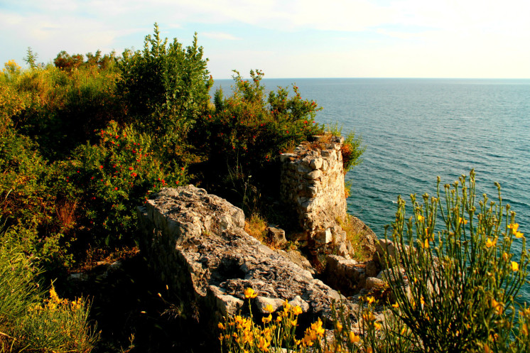 В общем, наслаждаясь прогулкой, шли мы тихонечко по высокому скалистому берегу мыса Ратац с севера на юг... Ну где же монастырь?... И вот наконец я вижу впереди развалины, заросшие всяко-разной травой и кустами... Круто заросшие... Упс... Я-то видела, наверное, зимние или ранне-весенние фотографии монастыря... А сейчас, в начале лета, за буйной дикой растительностью даже стен разрушенных зданий почти не видно.... Мелькнула мысль - так же, наверное, выглядела бы крепость Старого Бара, если бы она не была таким раскрученным туристическим местом....