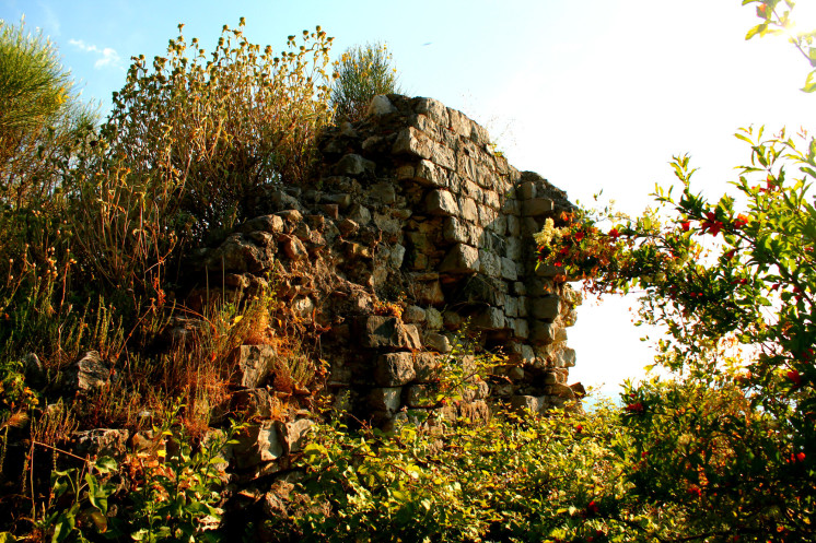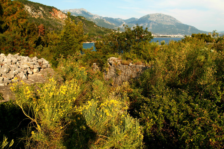Стоя на какой-то полуразрушенной стене шириной чуть больше длины моей стопы над самым обрывом (видимо, это остатки ограды монастыря), с трясущимися коленками (страшно же все-таки!) я сделала несколько снимков - к югу от мыса, в сторону Бара и к северу - в сторону Сутоморе. Красотища!! Даже не знаю, в какую сторону краше)) Добавляет колорита и то, что развалины монастыря усыпаны цветущими гранатами и кустиками дрона испанского (с желтыми цветочками), которые здесь уже начали отцветать...