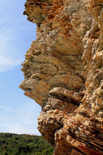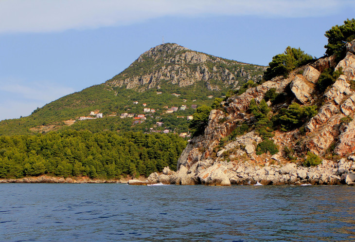 Огибаем холм Голо Брдо, на Викимапии он обозначен как бывшие каменоломни Сутоморе, на самом верху, ближе к пляжу Иво Новаковича, – обсерватория, а ближе к морю – руины старой крепости. Холм очень живописный, со стороны моря это отвесные слоистые скалы разных цветов, от белого до красно-коричневого, а сверху густо поросший соснами.