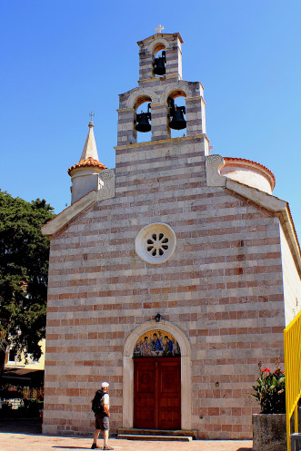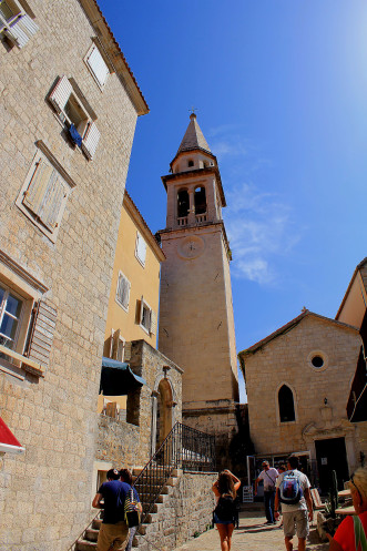 Немного побродив по улочкам, выходим к высокой башне с часами – колокольне церкви Святого Иоанна. Это самый известный католический памятник Будвы, один из главных символов города. Колокольня была здесь первой постройкой, позднее к ней пристроили епископский двор.