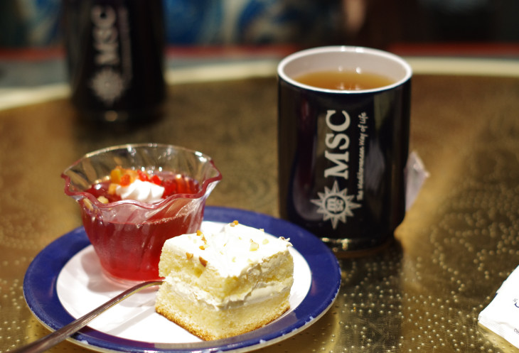 Шведский стол очень разнообразен: мясо, рыба, огромное количество закусок, пицца-паста (ведь лайнер-то Итальянский) овощи, фрукты... Да всего и не перечислишь. Хлеб на корабле пекут тоже сами. Мне очень нравился ресторан со шведским столом, т. к. находился на самом верху и столики стояли у панорамных окон. Также с него можно было выйти на палубу и поесть на открытом воздухе. А я любила просто посидеть там с чайком и записать мысли )))
