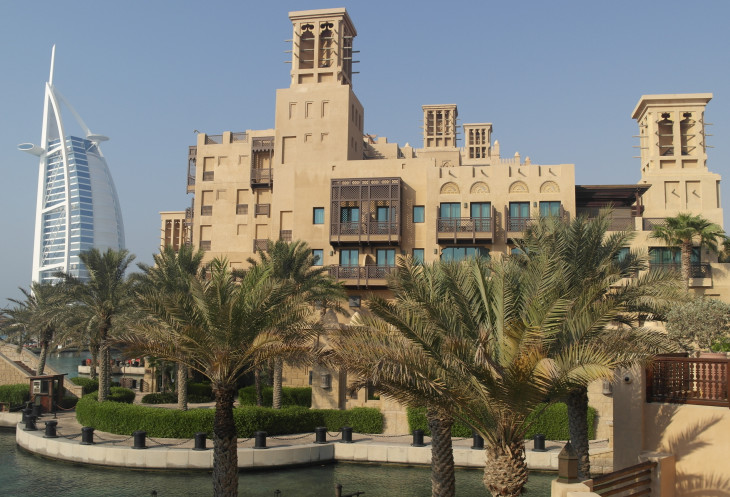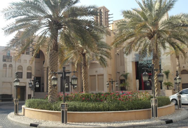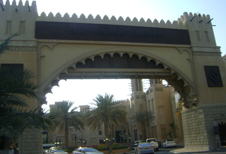 Сделав снимки на память, все поспешили в автобус. Только устроились в креслах – новая остановка. Интересный архитектурный комплекс, стилизованный под восточный базар – это и есть знаменитый арабский рынок Мадинат Джумейра (Madinat Jumeirah).