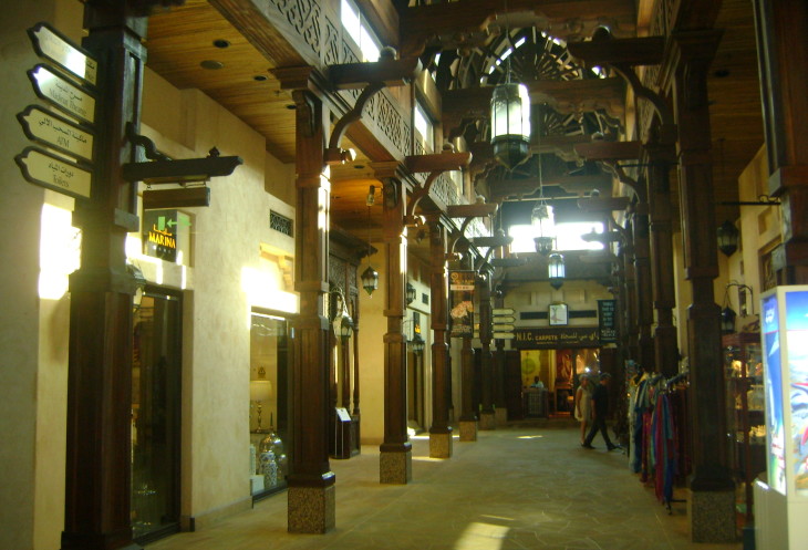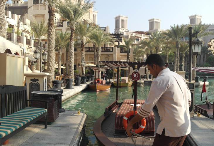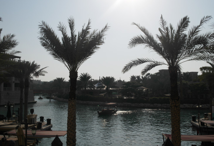 С рынка имеется выход к водным каналам и на причал арабских лодочек абра. Это своеобразная “дубайская Венеция”. Каналы и лодочки относятся непосредственно к сети отелей Madinat Jumeirah и используются постояльцами отелей для передвижения по территории отельного комплекса (т.к. она огромна). Оказалось, что катание на лодочках абра не входило в стоимость нашей экскурсии (какой "облом"!). Впрочем, за 75 дирхам можно бы покататься по каналам Джумейры и даже послушать песню корабельщика, но увы – даже 5 человек не нашлось, чтобы заполнить лодочку и доставить себе такое удовольствие! (((