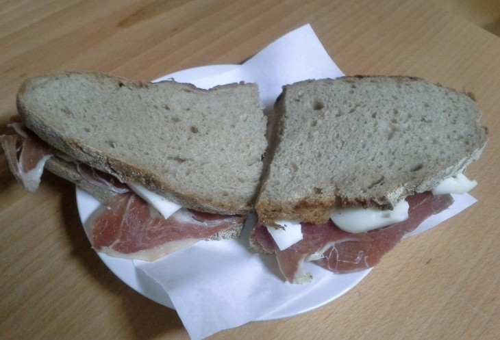 Но гора не отпускала, в первой же деревне мы остановились подкрепиться местным сэндвичем из ржаного хлеба, овечьего сыра и презунту. Есть мы особо не хотели, поэтому заказали один, за 3,50 евро. Когда хозяин принес нам два приличных размеров сэндвича, я с укоризной сказала ему, что заказывала только один!