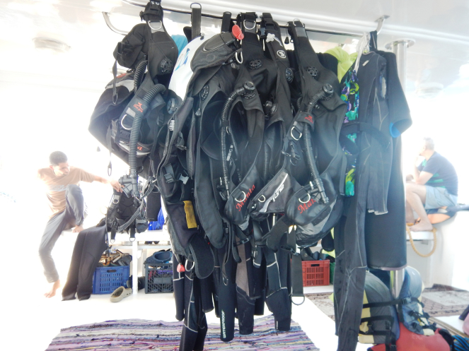 Разве можно быть на Красном море и удержаться от "посмотреть на подводный мир"? На мой взгляд, это невозможно. Поэтому дайвинг был обязательным пунктом нашей программы пребывания в Шарме. Больше чем на 15 метров я лично погружаться не могу (больное ухо не позволяет). Погружаемся мы не чаще, чем один раз в год. Сертификаты дайверов не получали. Назвать себя крутым дайвером не могу, но справиться с оборудованием сумею и под водой лишний раз суетиться не буду. Единственная возможность погружения - с инструкторами. Когда к морю нас заносит, всегда так и делаем. Выбирали погружение между "далеко, но одно по 30 мин.", и "близко на Тиране, но два по 25 мин." Выбрали второй вариант.