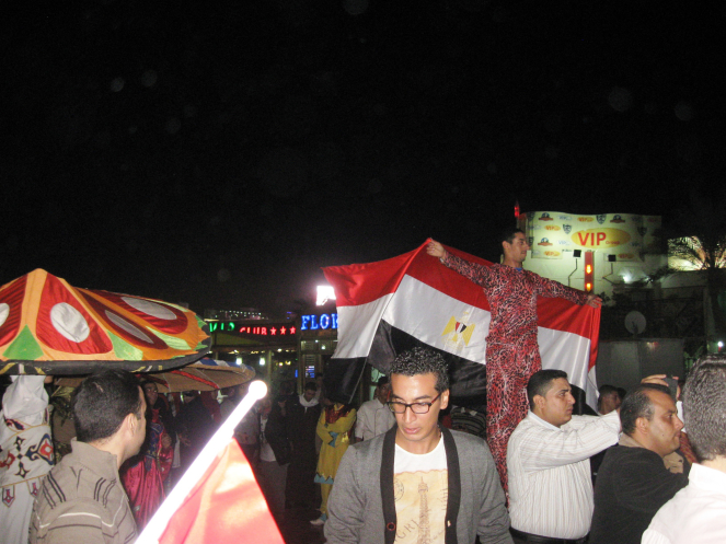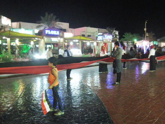 Ну вот я и рассказала вам, друзья мои, о нашем посещении Синайского полуострова. Хотя, есть еще событие, о котором хочу упомянуть в этой заметке. Перед самым нашим отъездом мы вышли пройтись по Наама-бей. А там вовсю праздновали что-то студенты Каирского университета, приехавшие на выходные в Шарм-Эль-Шейх. Я не знаю какой это был праздник, но так здорово было наблюдать за танцами, которые исполняли студенты. Вокруг них собралась толпа, люди радостно хлопали в ладоши, размахивали Египетскими флагами.