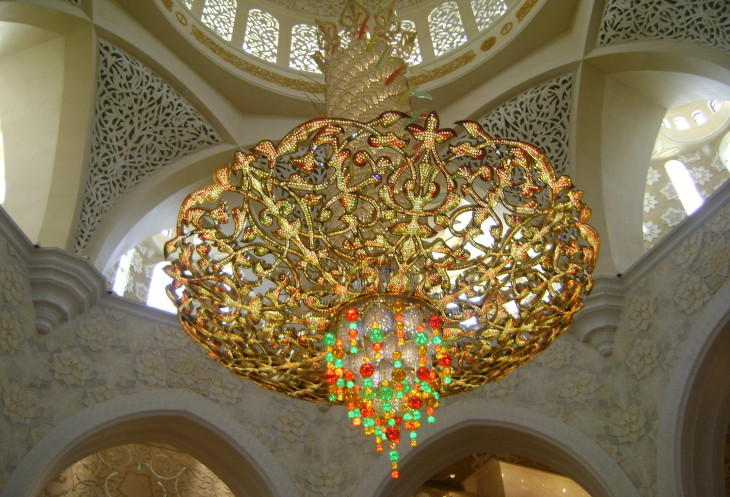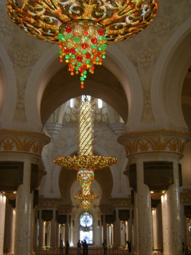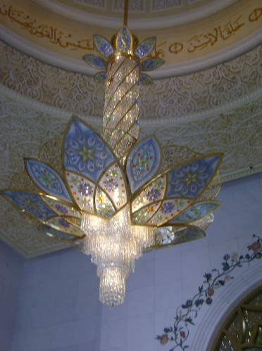 В центральном зале установлено семь стальных люстр, полностью покрытые тончайшими листами из золота и украшенные кристаллами Сваровски (изготовлены они были немецкой фирмой Faustig). В этом же зале расположена самая большая люстра в мире, которая когда-либо была установлена в мечети: её диаметр составляет 10 м, высота – 15 м, а вес – 12 т.