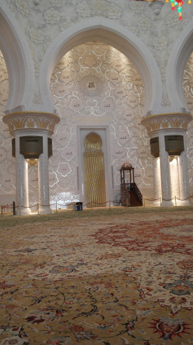 В главном зале также находится самый большой в мире ковёр ручной работы. Ковёр соткан в Иране по проекту иранского художника Али Халикия. Над его изготовлением трудилось 1200 ремесленников в течение 2 лет. Ковёр размером 5627 кв.м, на который было использовано 35 тонн шерсти и 12 тонн хлопка, стоит около 8,2 млн. долларов США. Вес ковра -47 тонн. Наши босые ноги ощущают приятную мягкость и теплоту этого ковра: