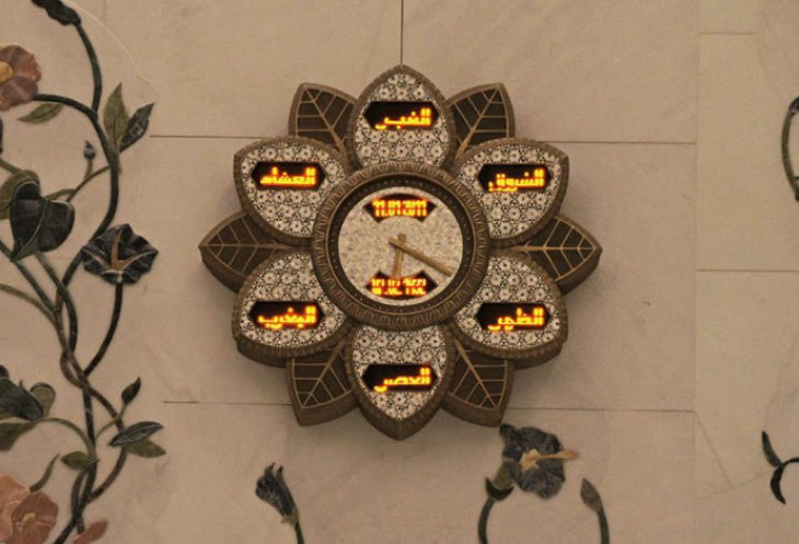 Наше внимание привлекли и необычные часы, которые висят в каждом из залов мечети. Они показывают дату, как по григорианскому, так и по исламскому календарю, а также указывают время молитв (5-кратных молитв и время выхода солнца), когда туристам запрещено находиться внутри мечети.