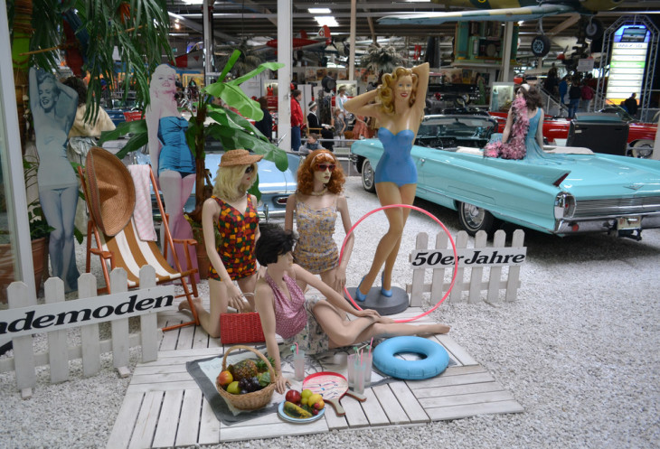 Все это разделено более-менее по периодам: 20-е годы, 30-е, 50-е. Между машинами расставлены и манекены, одетые в одежду соответствующего времени, плюс всевозможные сопутствующие аксессуары.