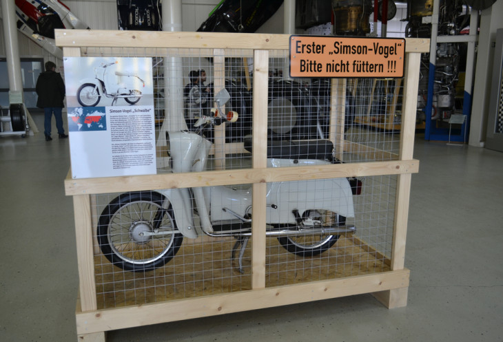 Кстати, на входе еще видели первый (созданный в 1961 г.) мопед класса «Simson-Vogel» (Симсон-птичка), посаженный в клетку, на которой висит табличка с надписью: «Первая „Симсон-птичка“. Пожалуйста не кормить!!!»