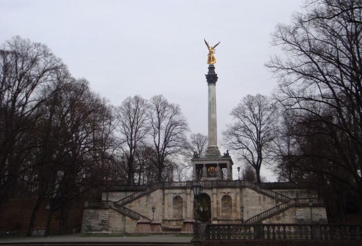 Причем народ очень бурно переживал по ходу действа: громко ахнул, когда один рыцарь «убил» другого, радовался, когда пустились в пляс бондари нижнего яруса фигур… После довольно длительного представления поехала к Максимилианеуму, там увидела вдалеке золотистую фигуру. Пройдя по зимнему Английскому саду вдоль реки, поняла, что это Ангел мира отсвечивал.