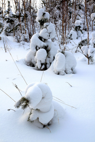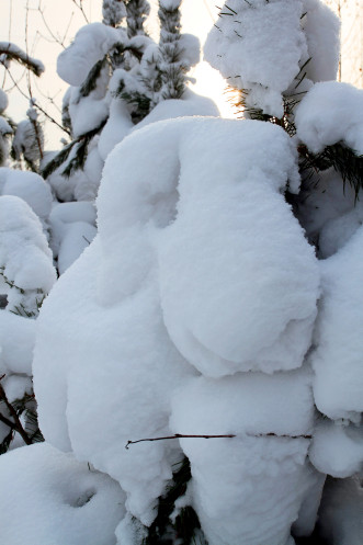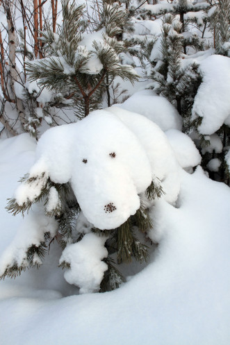 Гуляя на днях по заснеженным Уктусским горам на окраине г.Екатеринбурга и любуясь причудливыми сугробами и снежными шапками на молодых сосенках, я вдруг увидел, что среди них замаскировались удивительные снежные создания, похожие порой на знакомых нам зверей, а порой на совершенно сказочных существ.