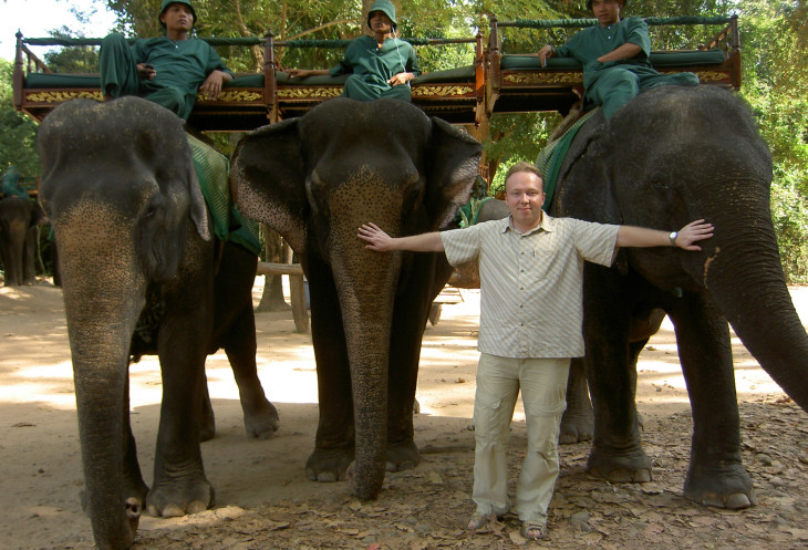 Следующим пунктом нашей программы стало катание на слонах. Стоит это удовольствие 10 баксов, за эти деньги вас прокатят на слоне вокруг древнего храма Байон, находящегося в центре города Ангкор Тома. Есть и второй вариант – подъем на слонах в гору (15 баксов), но гид отговорил нас от него. По его словам, одно дело – подниматься в гору, другое – спускаться. На слоне это не самое приятное удовольствие.