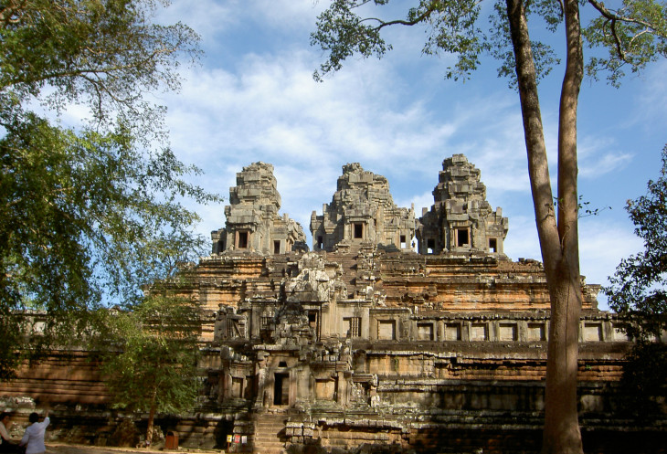 Затем мы поехали к древнему городу Ангкор Тому, по пути остановившись у храма Та Кео. Как и Ангкор-Ват, Та Кео символизирует священную гору Меру (центр мира), с прямоугольным основанием и пятью квадратными башнями. По виду храм чем-то напоминает пирамиду. Ступеньки, по которым наверх лезут туристы, очень крутые и сильно сточены временем. Поэтому перед входом в храм вывешена табличка «Climbing at your risk». В общем, если вы разобьетесь, никто не виноват. Такие таблички попадались и в других храмах Ангкора. Кимли также просил нас быть очень осторожными (сам он наверх не полез). Впрочем, несмотря на все предупреждения, туристы отважно карабкаются по храмам – вплоть до старушек преклонного возраста. Видимо, азарт и жажда познания дороже здоровья.