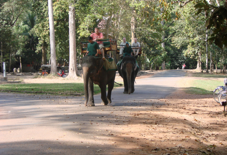Elephant Riding вокруг Байона длится около 10 минут. Мы раньше не катались на слонах, поэтому было забавно. Залезаешь на слона со специальной площадки, садишься на широкое деревянное сидение позади погонщика (не больше двух человек) и вперед! И, конечно, здорово ехать так вокруг Байона – одной из главных достопримечательностей Ангкора. Затем можно неспешно сфотографироваться со слонами или покормить их бананами, которые продаются здесь на каждом шагу.