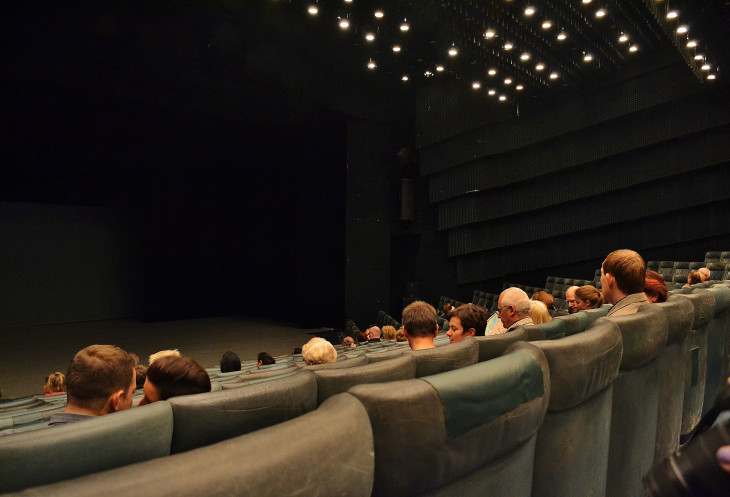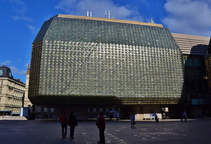 VI. Про "Дивадло". Занесло нас в театр. Начиталась я, что такой необычный театр, волшебство просто. Да и сейчас читаю в интернете и просто глазам не верю, что это всё про " Латерна Магика" написано. Здесь на сайте есть описание театра. Единственно, здание построено в 1977 году, а не в 1992. Не ходите туда никогда. История театра началась со спектакля, поставленного к Всемирной промышленной выставке в Брюсселе в 1958 году. Для того времени, это, наверное, была супер новация. С 1970-х годов театр входит в состав Национального театра. Здание оригинальное. Но зрелище убогое, как и зрительный зал. Нет ни одного целого кресла, все в заплатах! Мы смотрели спектакль "Коктейль", то есть лучшие номера за все годы. Ну вот первый номер и запомнился. На чёрно-белом экране клоун на роликах катиться по улицам Праги. Потом он сходит с экрана на сцену. Танец с девушками на роликах. И затем обратно уезжает в мир кино. Остальные номера-смесь балета и акробатики на фоне красивых компьютерных картинок.