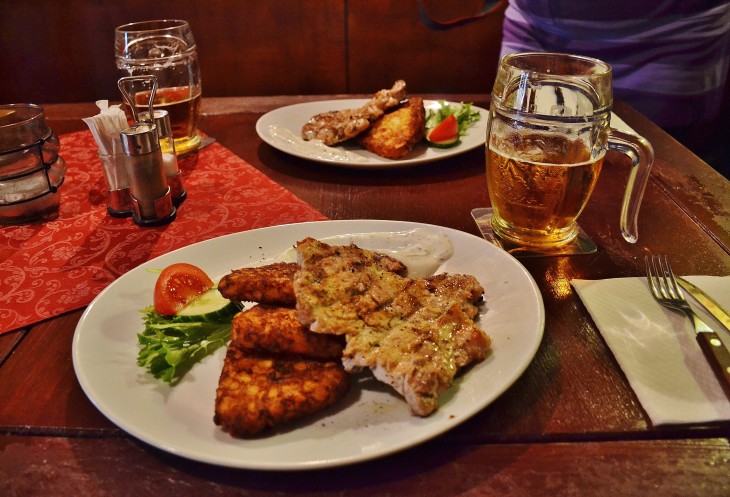 IV. О ЕДЕ! Для себя я окончательно уяснила, что приготовление блюд у близких друзей Австрия-Германия-Чехия, не совсем в моём вкусе. Просто та сильно зажаристая корочка на всех без исключения мясных блюдах мне не по душе. Это чисто моё восприятие! Мы вкусили : вепрево колено, конечно; моравского воробья с кнедликами; утку с капустой; полевку-гуляш в хлебе; жареный сыр с картофельной подушкой и всякие десертные вкусняшки. Больше всего мне понравился обед в Мельнике в Пиратском ресторане. Треугольные картофельные котлетки и стейк. Просто, не пережарено, не пересолёно, вкусно! Пиво везде выше всяких похвал, хоть мы и не знатоки. Нам понравилось больше всего тёмное, сладковатое. А вот на счёт знаменитых "омачек" я не поняла. Нигде нам их что-то не давали и не предлагали. Итак, фоторяд: