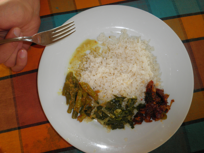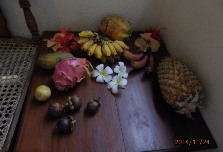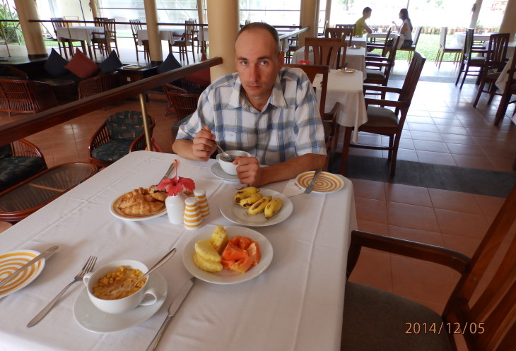 Завтраки здесь в виде шведского стола с большим выбором блюд. Начинался этот шведский стол с нескольких видов мюслей, далее были чай, кофе, молоко, потом стояли два повара и можно было заказать им яичницу с различными ингредиентами. Потом стоял огромный стол с множеством готовых блюд как местной так и более интернациональной кухни. В конце этого стола стояли фрукты, правда с ограниченым выбором (бананаы, ананасы, папайя, арбуз) и соки нескольких видов, правда из пакетов. В целом завтраки были вкусными и сытными. Было только одно ограничение, на територии зала ешьте сколько влезет, но ни в коем случае нельзя выносить еду с собой. Дико, но правда, даже специальные вывески были размещены об этом на русском и английском языках. За нами всегда пристально наблюдали охранники. Вот такие вот дела.