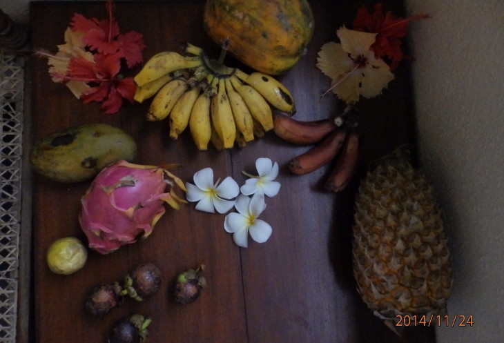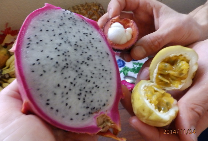 Купили мы желтые и красные бананы. Кстати желтые бананы тут есть разных вкусов, но нам особенно понравились красные. Такжи купили ананас - это не сравнимо с теми, что продают в наших магазинах, они очень сладкие, сочные и ароматные. Питахайя - это плод особого вида кактуса, ниже он в разрезе - белая масса с черными косточками - фрукт на любителя, мне не понравился, жене наборот пришелся очень по вкусу. Мангостин - фиолетовый фрукт внутри белый и разделен на дольки, как наш чеснок, очень вкусный. Папайя - это эдакая тропическая дыня, внутри желтого или же оранжевого цвета, если правильно ее выбрать то очень даже вкусненькая. Маракуйя - кисленький фрукт желтенький в серединке и имеющий множество косточек в мякоти, нам не очень. Еще пробовали королевский кокос, который нам не понравился, сок его соленовато-сладкий, на любителя.