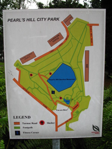 Первым объектом на нашем пути стал найденный на карте небольшой местный парк Pearl's Hill City Park. Чтобы добраться до него от отеля, необходимо пройти всего метров 400-500 по двум улицам. Просыпающийся город пока еще только возвращался к жизни после ночи - на улицах было мало машин, прохожих практически не видно, а все магазины и кафе за редким исключением еще закрыты. Однако, знакомый путешественникам по Азии магазин сети 7-11, был открыт, и мы смогли запастись в нем первоначальным объемом жидкости, которой, по нашим ощущениям, предстояло выпить немало в течение долгого тропического дня.