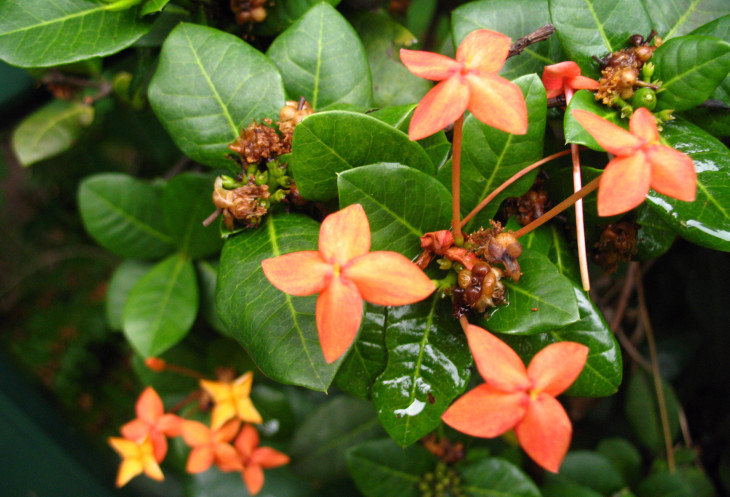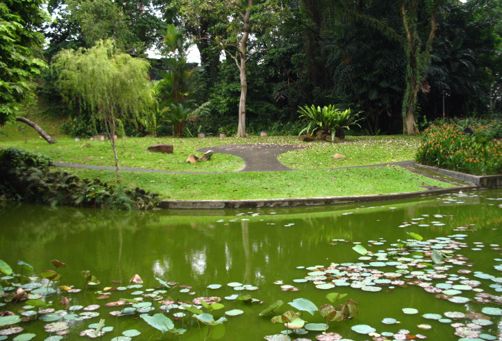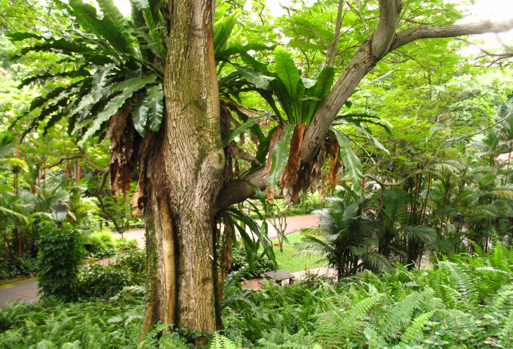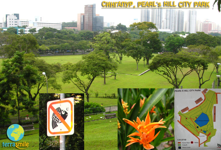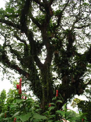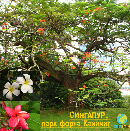 Прогуливаясь по аллеям вдоль террасы, увидели большое дерево с широкой и разветвленной кроной с оранжевыми цветами и множество других деревьев, цветущих красными, белыми, розовыми, желтыми цветами. Сквозь буйную растительность в некоторых местах на краю холма можно увидеть и сфотографировать интересные виды прилегающих районов Сингапура.