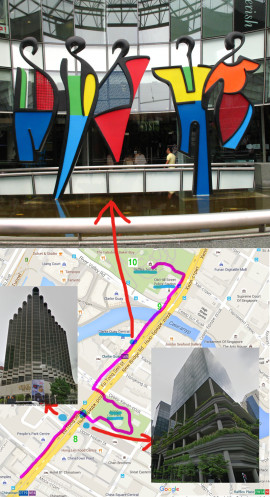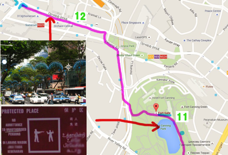Первой частью нашего маршрута является осмотр парка и пары огибающих его улиц, после чего планируется углубиться в китайский квартал, обойти его по периметру и, вернувшись к отелю, начать путешествие в самое сердце Сингапура - улице орхидей. Предлагаю Вашему вниманию первый отрезок пути на карте, цифры соответствуют центральным местам репортажей и их номерам.