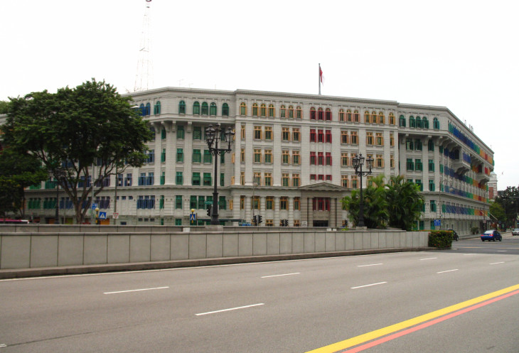 А прямо по пути с левой стороны сразу за мостом стоит интересное здание Old Hill Street Police Station (OHSPS), в котором раньше располагался полицейский участок, а в настоящее время Министерство информации, коммуникаций и искусств Сингапура. Это историческое здание в неоклассическом стиле объявлено национальным памятником истории и культуры в 1998 году. Оно насчитывает более 900 окон, раскрашенных в разные цвета, внутри все выполнено в итальянском стиле - аркады, колонны, балконы. В общем нам оно понравилось и пришлось сделать несколько фото этого шедевра.