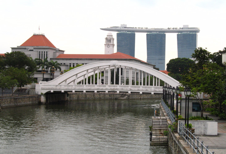 Проследовав вдоль торгового центра дальше, через пару сотен метров мы оказываемся на мосту через речку Сингапур, который называется Coleman Bridge. Посмотрев направо, видим вдалеке верхушки башен Marina Bay Sands, куда мы непременно заберемся, но не сегодня. Хотя мосты в этом месте небольшие, все равно панорамный вид с них лучше вследствие большего пространства, не перекрытого высотными зданиями. Под нами с обеих сторон реки как раз проходят те самые известные набережные, на которых все в один голос рекомендуют отведать настоящей сингапурской еды.