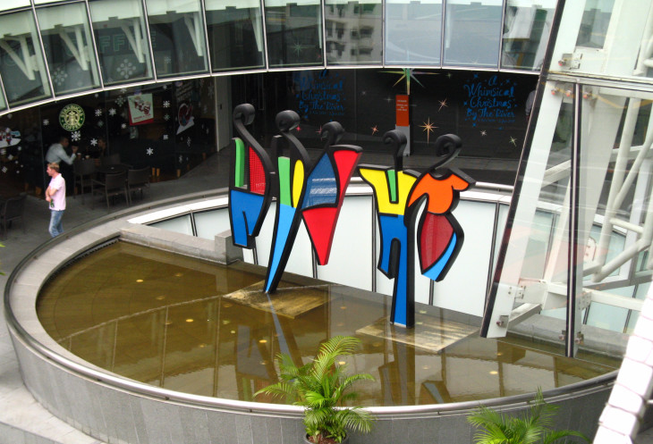 Двигаясь дальше в центр города, мы дошли до крупного торгового центра Clarke Quay Central, на центральном входе которого установлены необычные по дизайну скульптуры - вы можете их видеть на фото. В сам центр не заходили, но, судя по размерам, он является весьма подходящим для полноценного шопинга. Прямо напротив здания расположены выход из одноименной станции метро, остановка общественного транспорта и стоянка такси, поэтому транспортировка ваших покупок в отель не будет представлять никакой сложности.