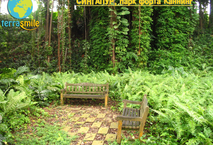 Отдохнув на одной из множества скамеек под пение птиц и треск цикад, перемещаемся в северную часть форта-парка, где собственно и находится большинство основных построек. По пути случайно находим место редкой красоты - пара скамеек в окружении лиан, свисающих с высоких фикусов, папоротников, как будто специально созданное для романтических свиданий.
