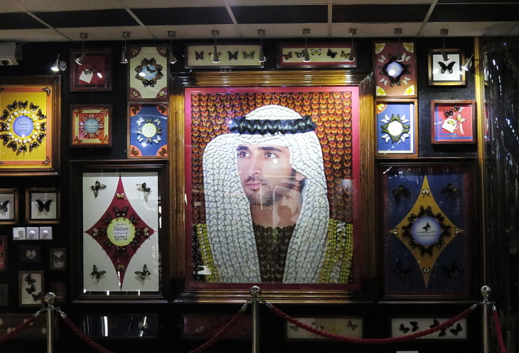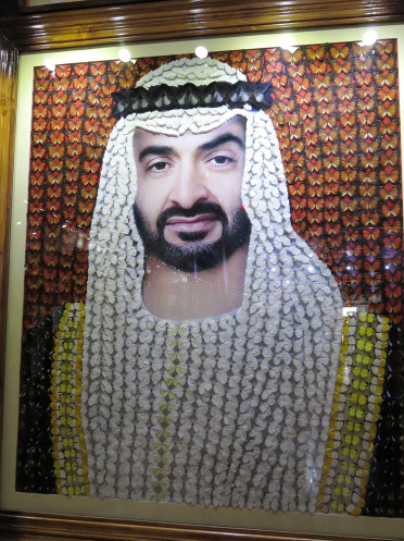 Пройти мимо этой небольшой экспозиции просто не возможно. Мы переходили от одной картины к другой, охали и ахали, разглядывая каждую бабочку, каждого жучка. Бабочками выложены портреты Президента ОАЭ, правителя Абу-Даби, Вице-президента, Премьер-министра, правителя Дубая шейха Мохаммед бен Рашид Аль Мактум.