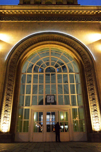 Здание построено в 1956 году и отделано розовым туфом с каменной резьбой.С вокзала поездов ходит мало и на ночь его закрывают. Когда мы подошли,двери были уже закрыты.Вася постучал и объяснил охранникам,что мы туристы и хотим посмотреть вокзал изнутри.Удивительно,но нас впустили!!! Попросили только не фотографировать.Внутри здание свежее и отремонтированное.Нам понравилось).