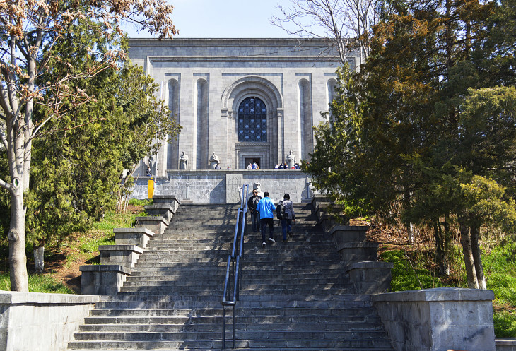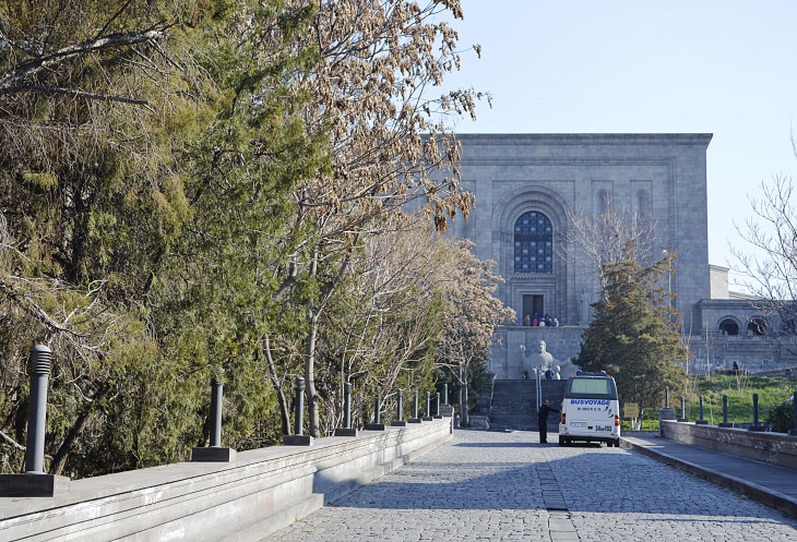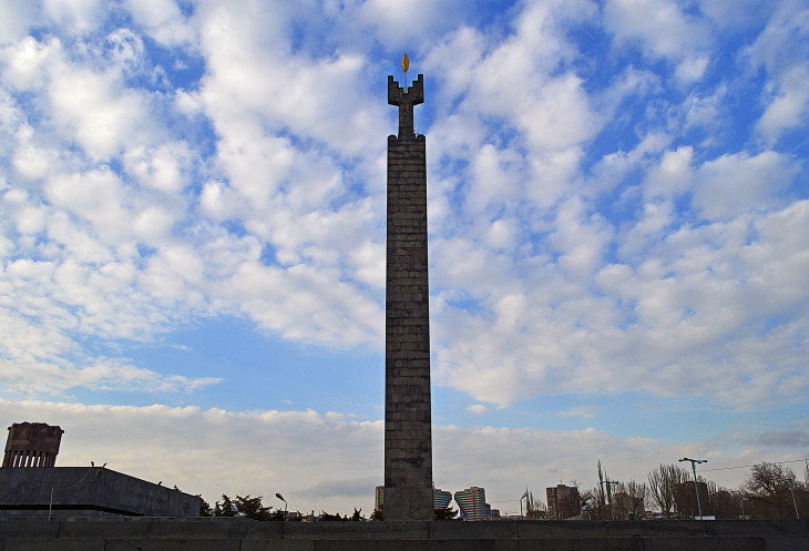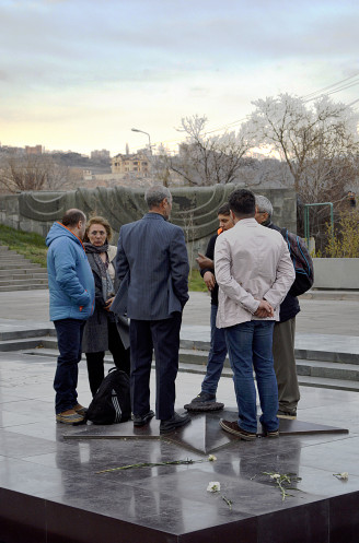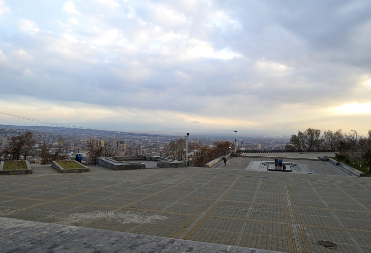 Потом увидели,что внизу у "Вечного огня",вернее прямо на звезде стоит группа туристов, слушает своего гида и греется.Стало так обидно...Ведь огонь горит в честь погибших армян на войне...А гид ведь ,наверняка,об этом и рассказывал... Я не выдержала и пошла к ним...Иностранцы...Что я им скажу?...