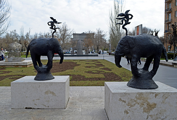 Все эти скульптуры принадлежат частной коллекции американского миллиардера,армянского происхождения,Джерарду Гафесчану.Он же и спонсировал строительство Каскада,после развала СССР. Надо сказать,что многие армянские олигархи,живущие за границей,помогают Армении.Некоторые ,даже ни разу не были в этой стране,но выделяют деньги на разное строительство и благотворительность.Еще одна прекрасная черта характера армян.