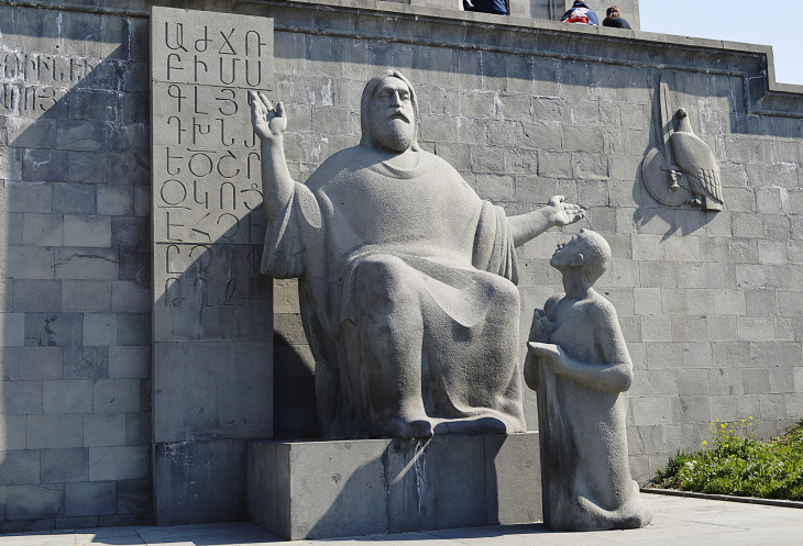 Перед музеем стоит памятник создателю армянского алфавита Месропу Маштоцу с учеником.