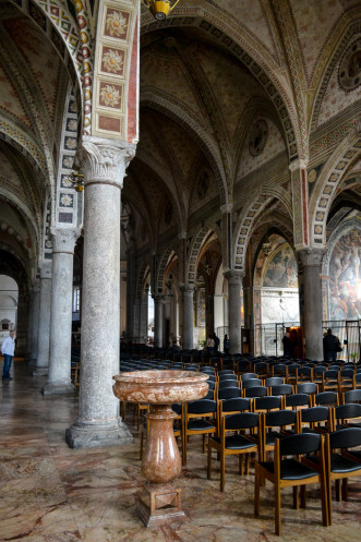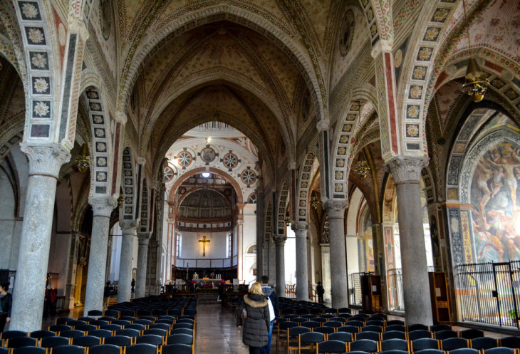 Церковь, являющаяся частью доминиканского монастыря, очень приятная и светлая. Построенная в конце XV века, она неоднократно ремонтировалась и достраивалась. Так с середины XVI до конца XVII века в ней постоянно шел ремонт, в результате чего здание украсили фрески Феррари и Серано. Считается, что над дизайном церковной апсиды работал Донато Браманте, хотя документальных подтверждений тому и нет.