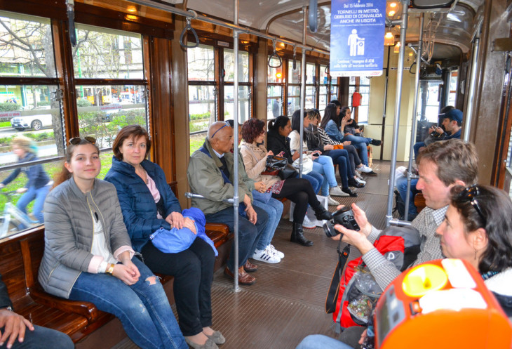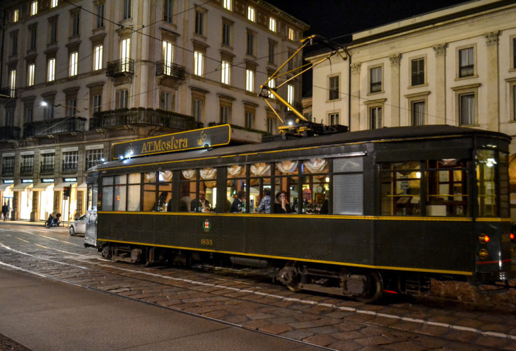 Да, один такой трамвайчик–ресторан «АТМосфера» ходит по историческому центру Милана. Мы как раз видели его накануне вечером около Ла Скала.