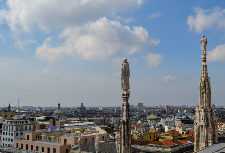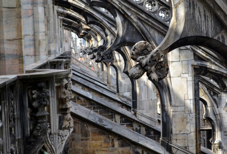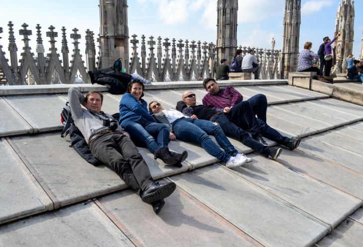 Все эти мраморные кружева, из которых сплетен миланский собор и вблизи выглядят потрясающе. Тут же, на крыше, можно и сесть, и прилечь, если сильно хочется. Места предостаточно для всех желающих.