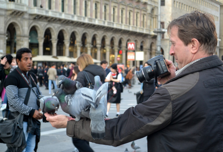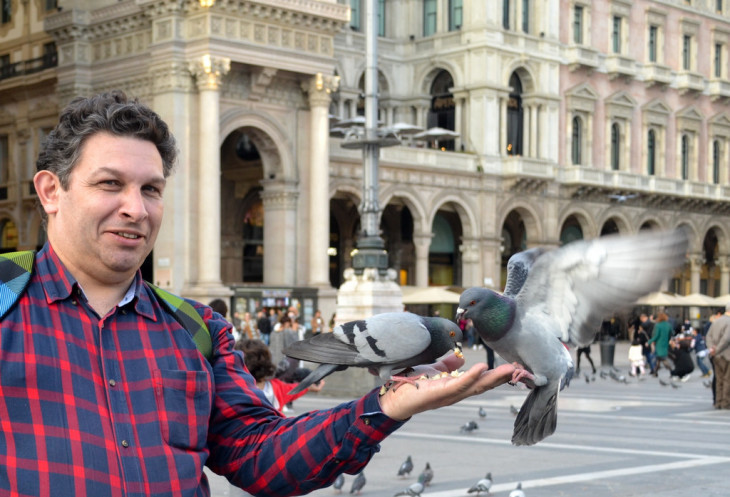 К Соборной Площади мы попали в самое правильное время. После обеда, ближе к закату солнце освещает собор с его лицевой стороны. То, что нужно для съемки. Голуби также были на месте. Мы сразу достали хлеб, и пошла жара…