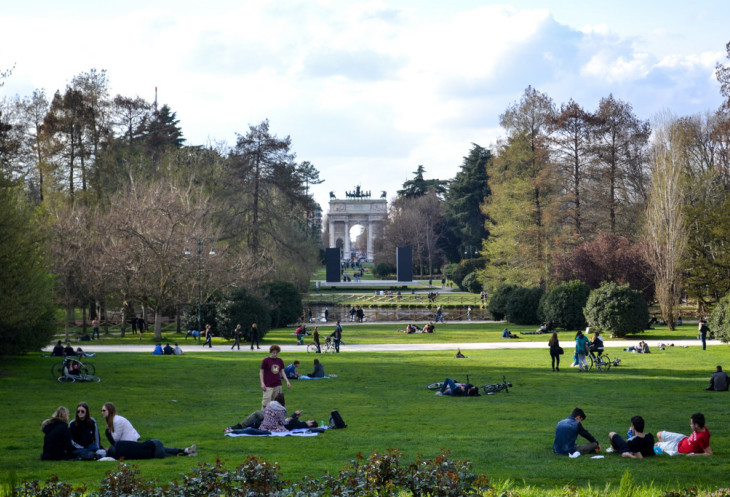Пока мы не спеша шли его тропинками в сторону Арки Мира (Arco della Pace), расположенной на противоположном Замку Сфорца краю парка, мы не видели практически ни одного свободного от людей клочка травы.