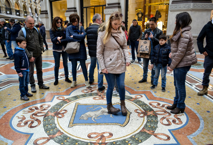 Если стать в самом центре галереи лицом к Соборной площади, то справа от вас на полу галереи окажется изображение многострадального быка, посредством гениталий которого миланцы и многочисленные гости города пытаются решить свои меркантильные проблемы.