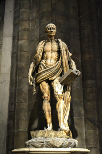 Именно в таком виде и запечатлел святого итальянский скульптор Марко Д'Аграте. С содранной кожей, которая как плащ перекинута через плечо и опоясывает Святого Варфоломея. Статуя выполнена с такой анатомической точностью, что сам автор написал на постаменте: "Не Пракситель создал меня, а Марко д’Аграте". Так, на всякий случай, чтобы не перепутали. Скромный, видать, был малый.