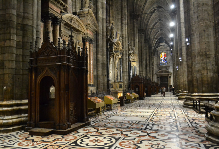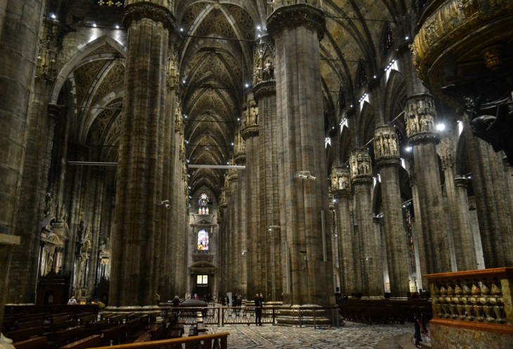 Итак – миланский Кафедральный Собор. Внутри это величественное ажурное здание выглядит несколько мрачным и массивным. Очевидно, из-за скупого освещения и обилия мощных тяжелых колонн, будто вековые кедры, тянущиеся вверх к самому куполу.