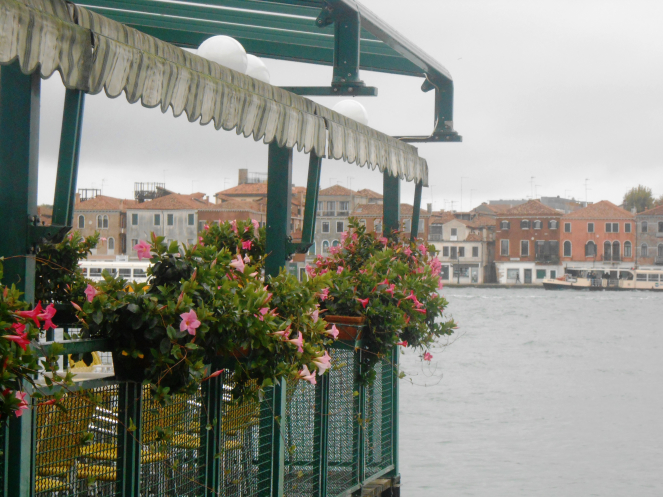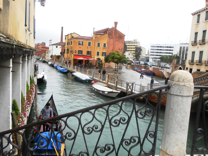 Поскольку в Маргере особо смотреть не на что (спальный тихий городок), то мы отправились осматривать островную часть. В 600 метрах от кемпинга находится автобусная остановка, откуда можно добраться до железнодорожного вокзала Венеции Санта-Лючия. По приезде в ж/д вокзал нас ожидал мелкий дождик. Он особо не мешал, но поскольку мы планировали гулять длительное время на открытом воздухе, то приобрели себе зонтов (я с изображением гондолы на Гранд-канале) в ближайшем сувенирном рынке.