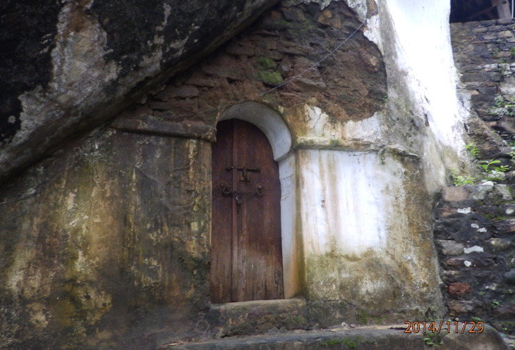Чуть выше расположена еще одна грунтовая площадка, на которой находится устроенное в скальной нише хозяйственное помещение. Нам его не открывали, так как со слов хранителя ключей от храма это помещение пребывает в аварийном состоянии и от этого очень опасно.