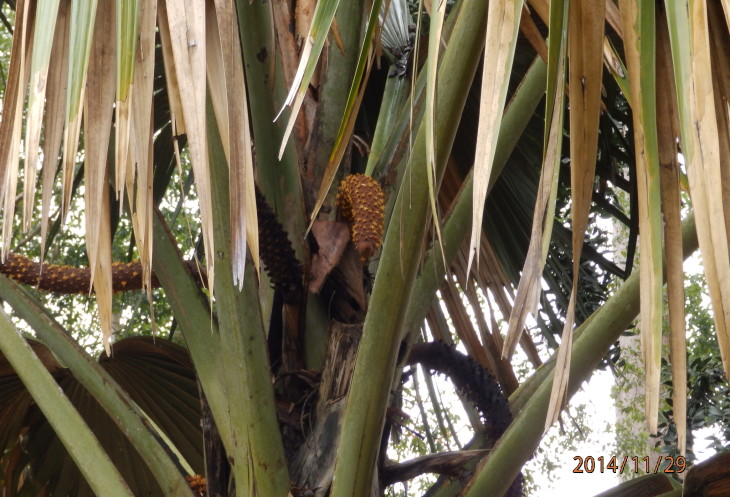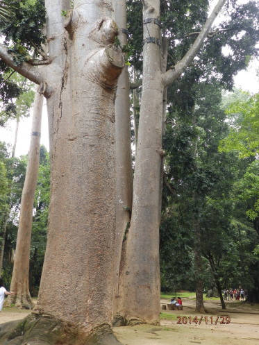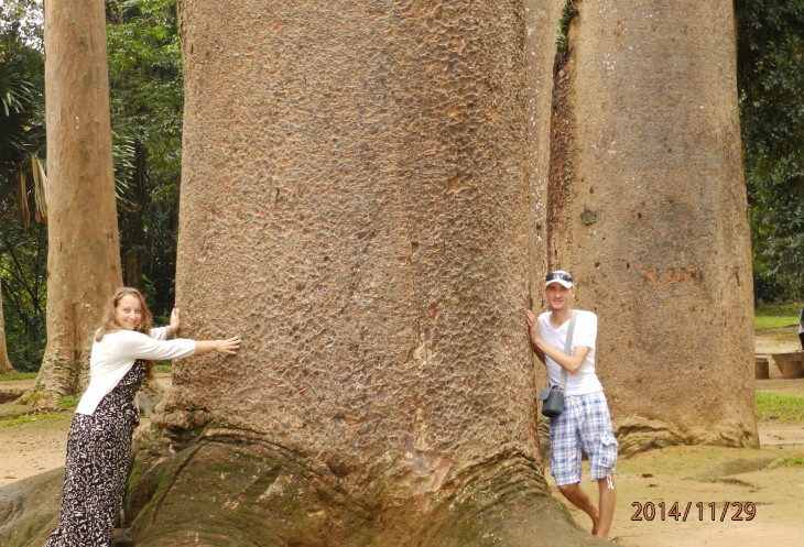 А напротив этих пальм растут несколько слоновьих деревьев. С виду они огромны и кажется, что ничто их не сможет сокрушить, но, как рассказал наш гид, на самом деле они очень хрупкие и потому усилены в кронах многочисленными стальными опорами.